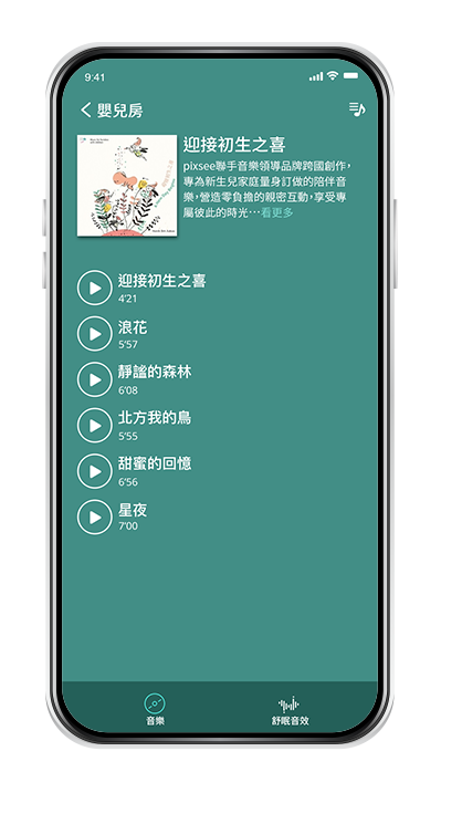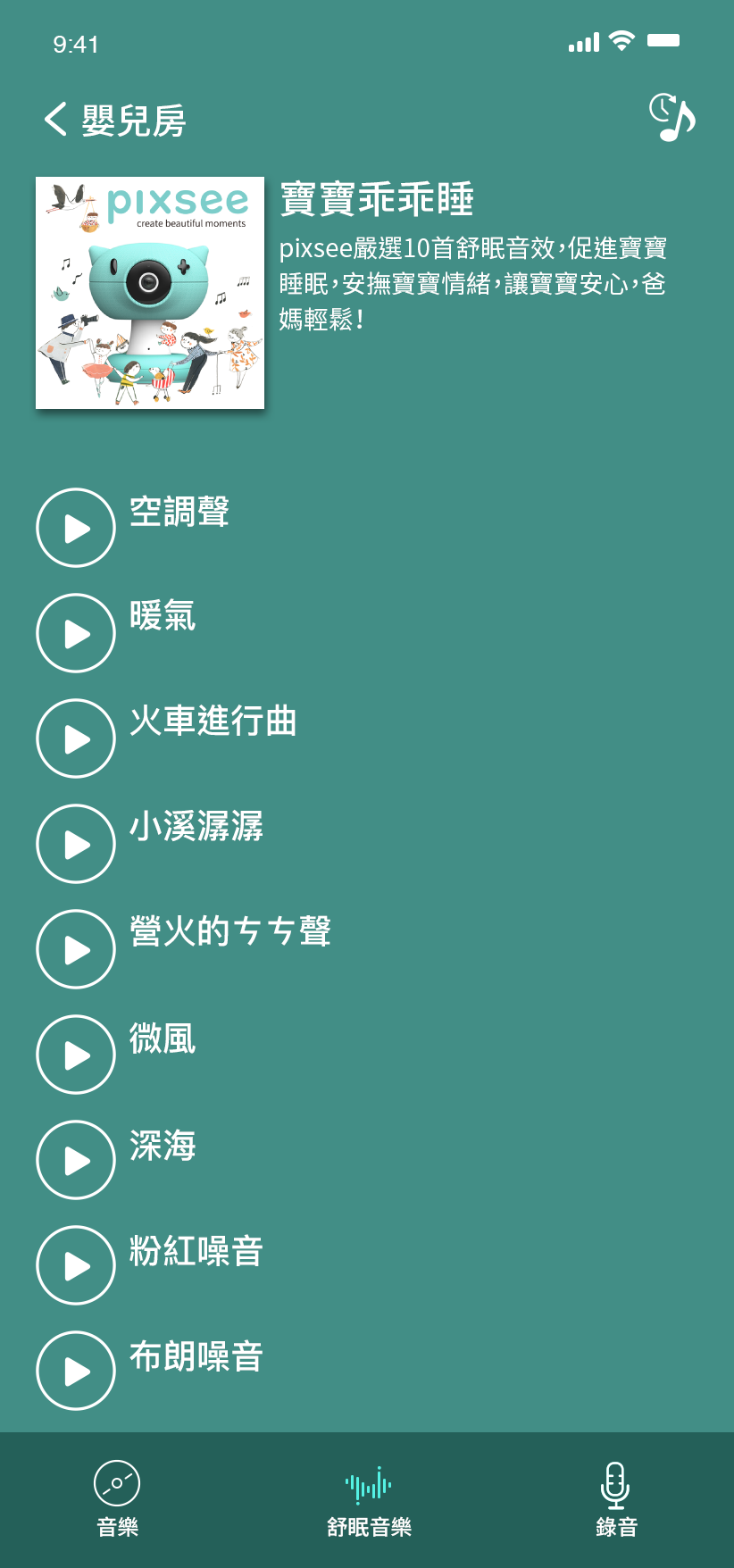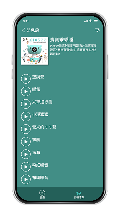 Pixsee嚴選白噪音、粉紅噪音、環境音效等舒眠音效,幫助寶寶安心入睡。
