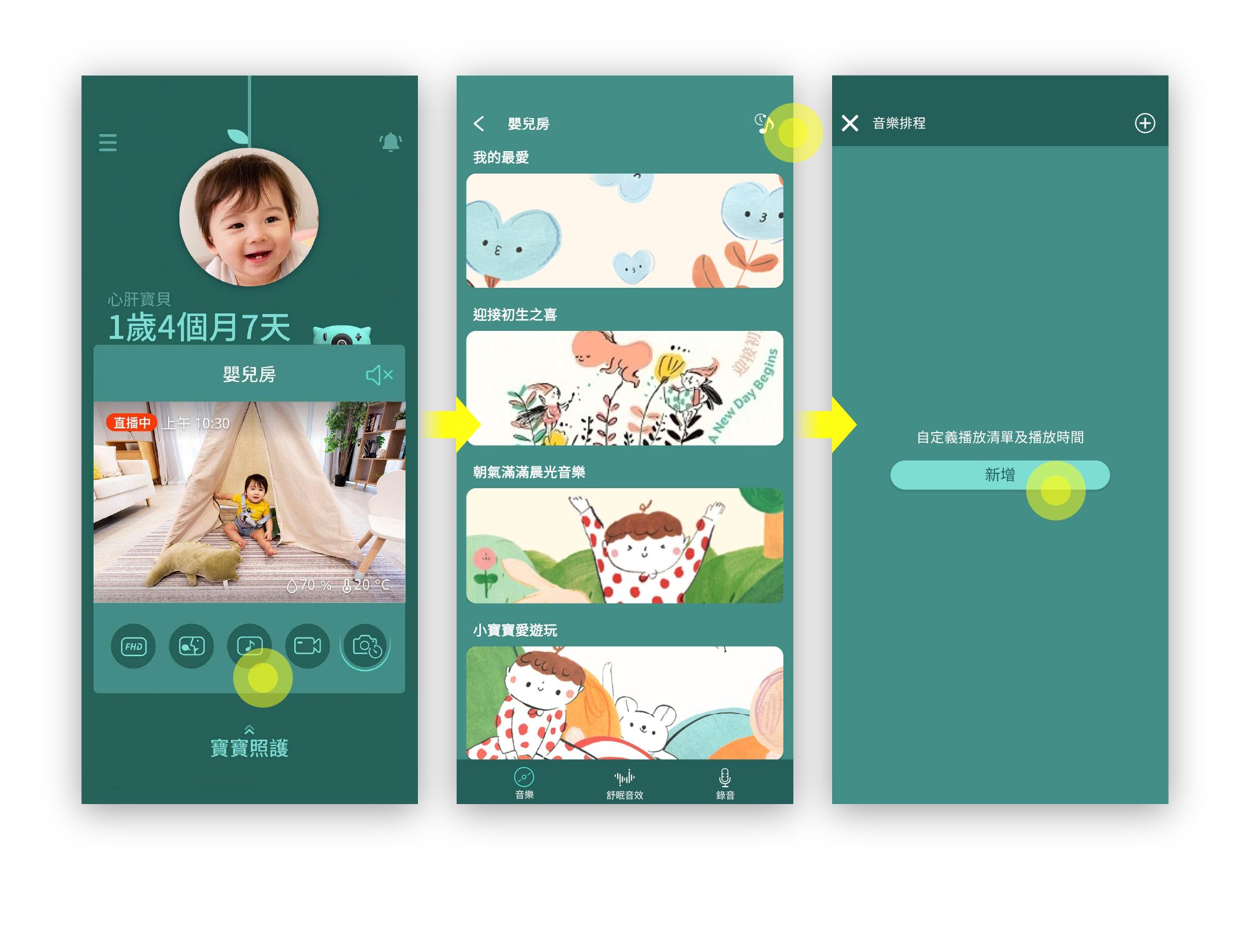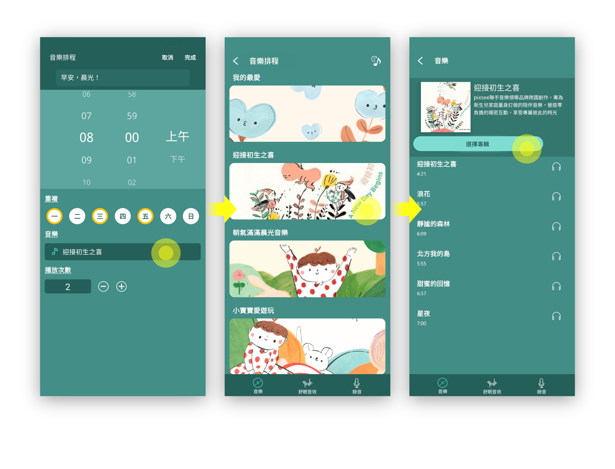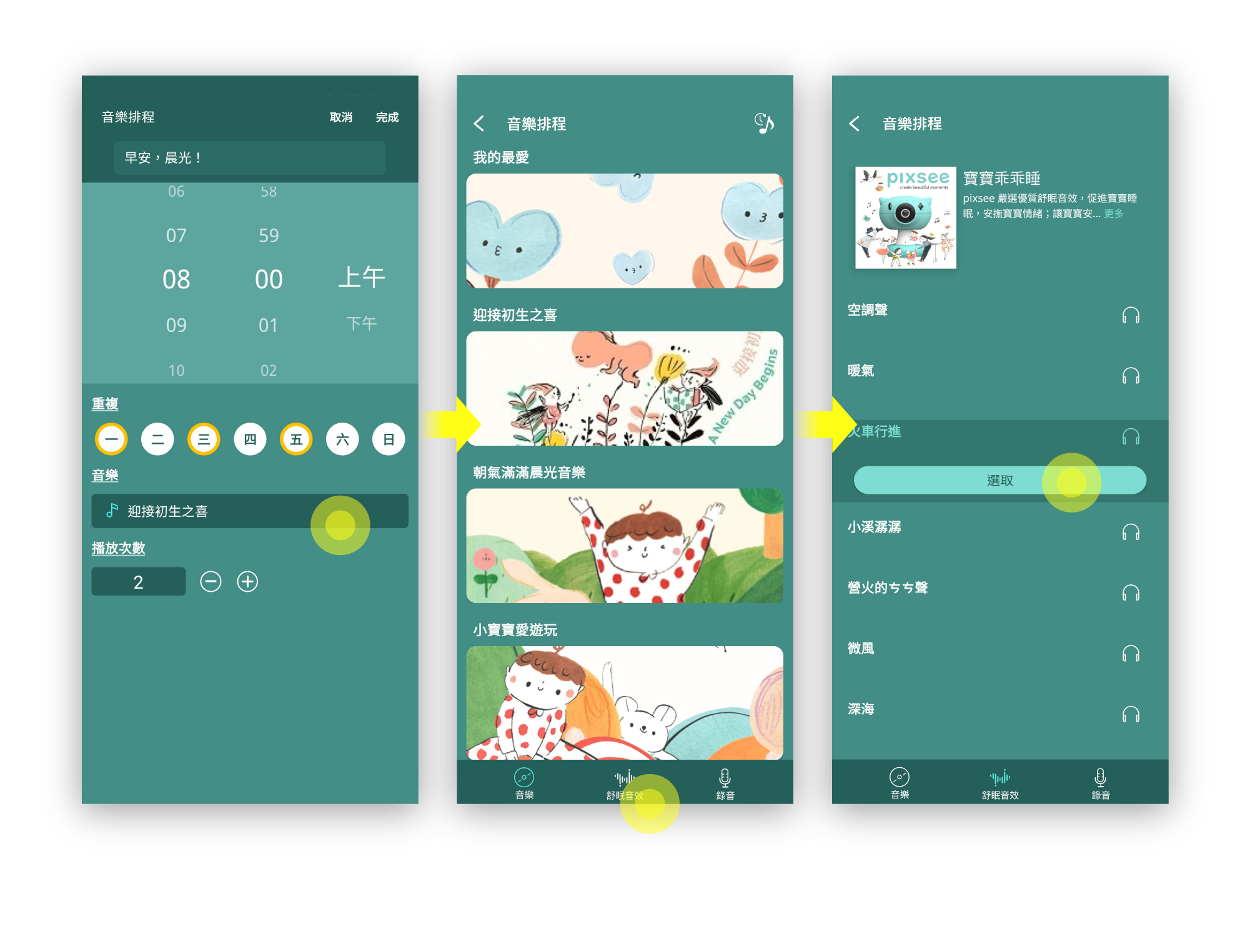 Pixsee 為您和寶寶客製在不同狀態下可播放的歌單、播放時間與次數,例如:早安 晨光、寶寶好食光、小睡充電等。