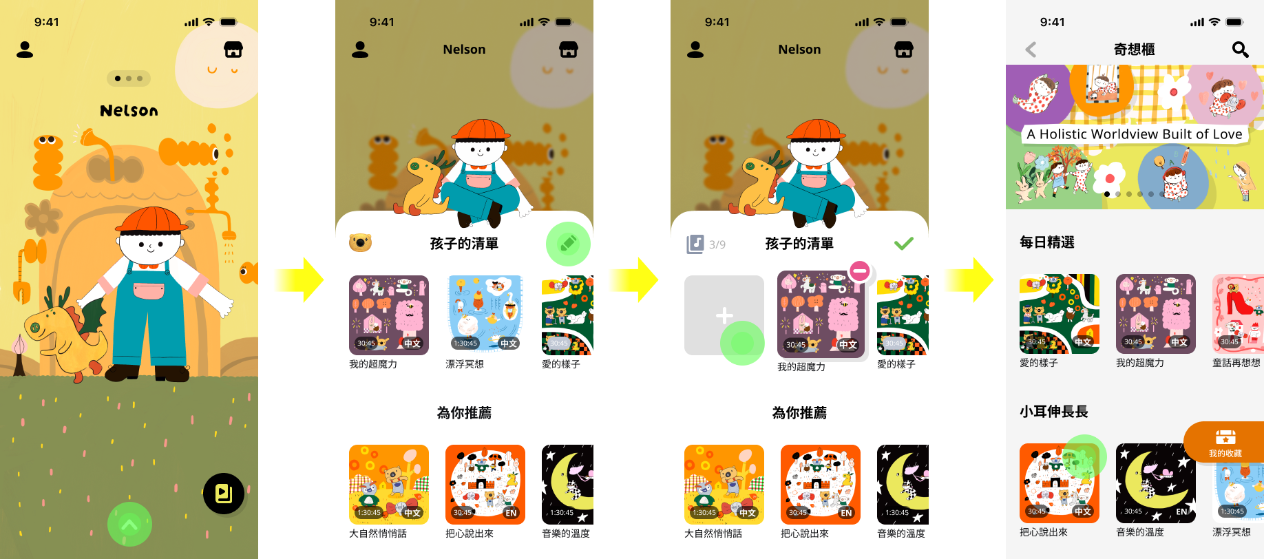 3.您可以新增或刪除故事集,也可以長按並拖曳故事集來調整播放順序。(每位孩子最多可設定 9張故事集)。