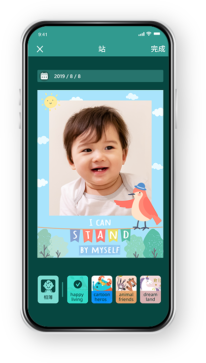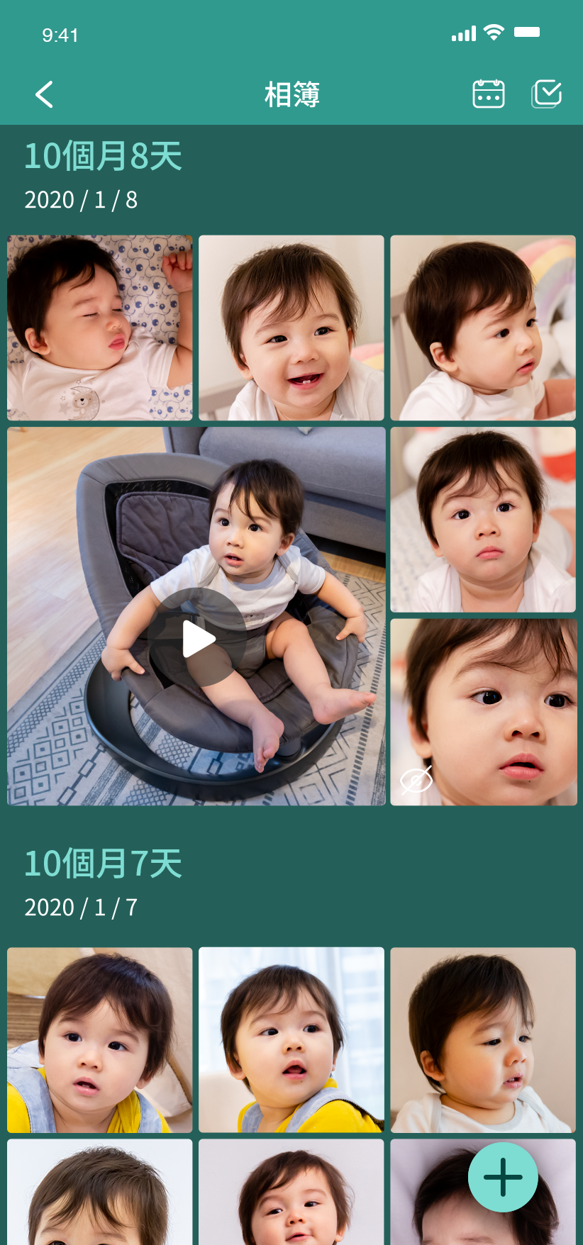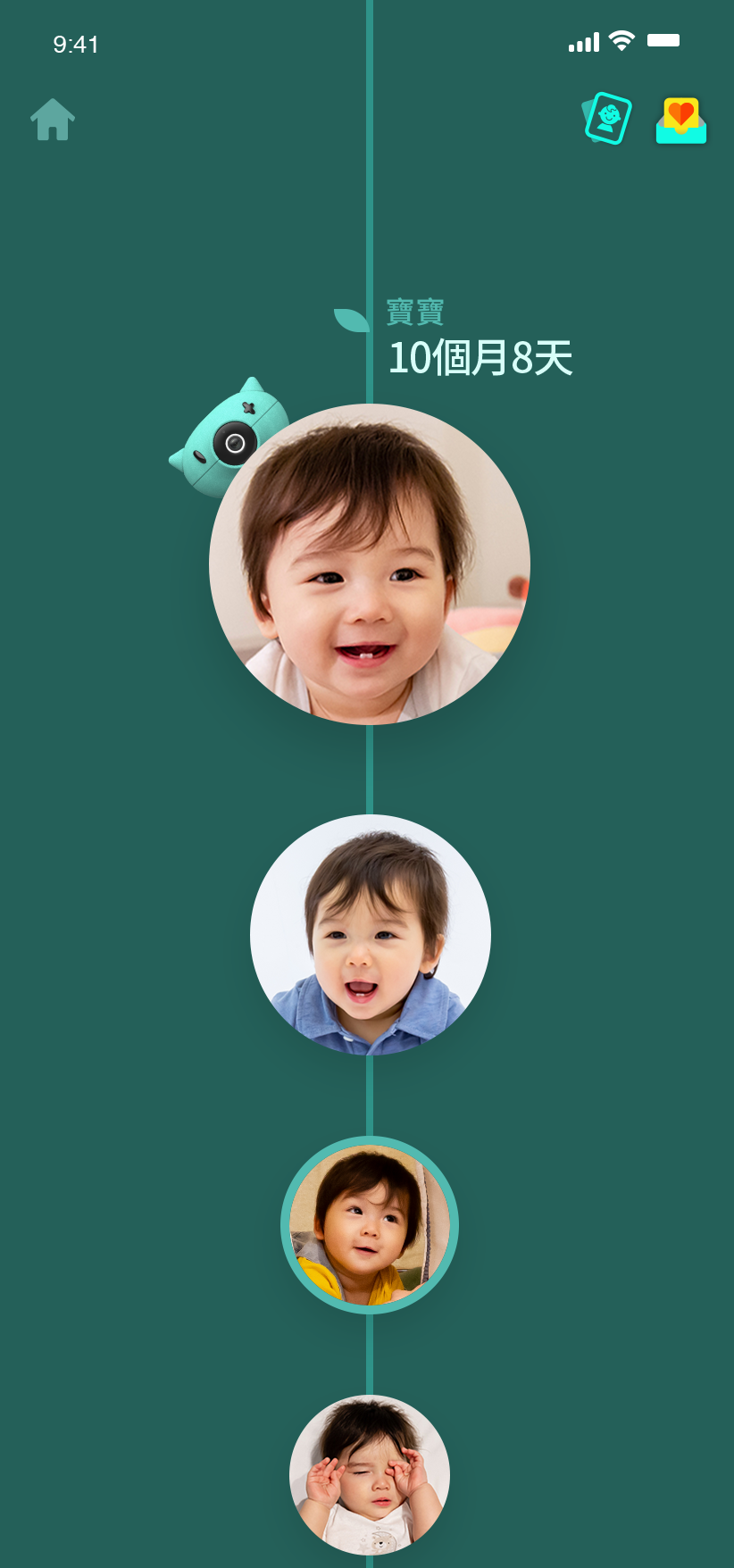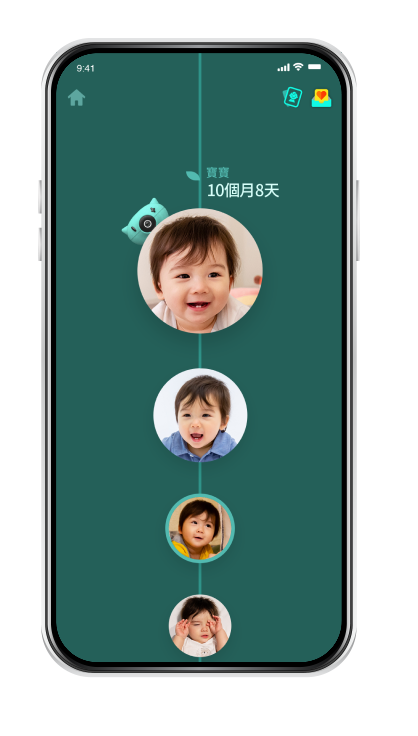 每天480張/每週336張/每月720張定時拍攝的相片串集成40至60秒短片,搭配內建音樂,在時光流動中體驗寶寶成長與育兒生活的感動。