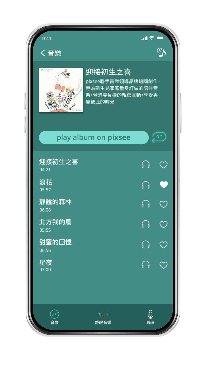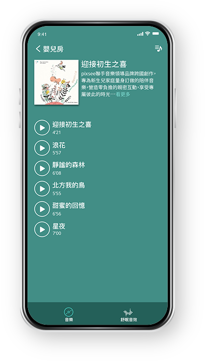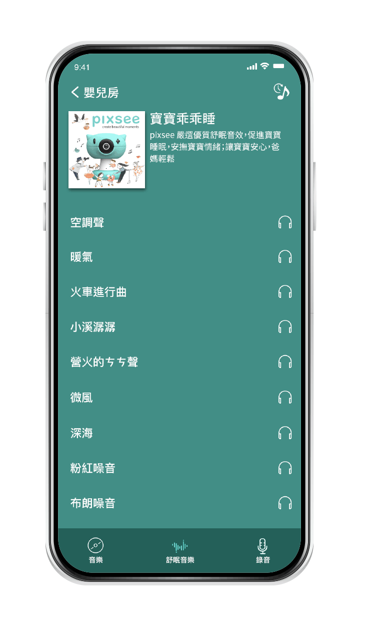 Pixsee嚴選白噪音、粉紅噪音、環境音效等舒眠音效,幫助寶寶安心入睡。