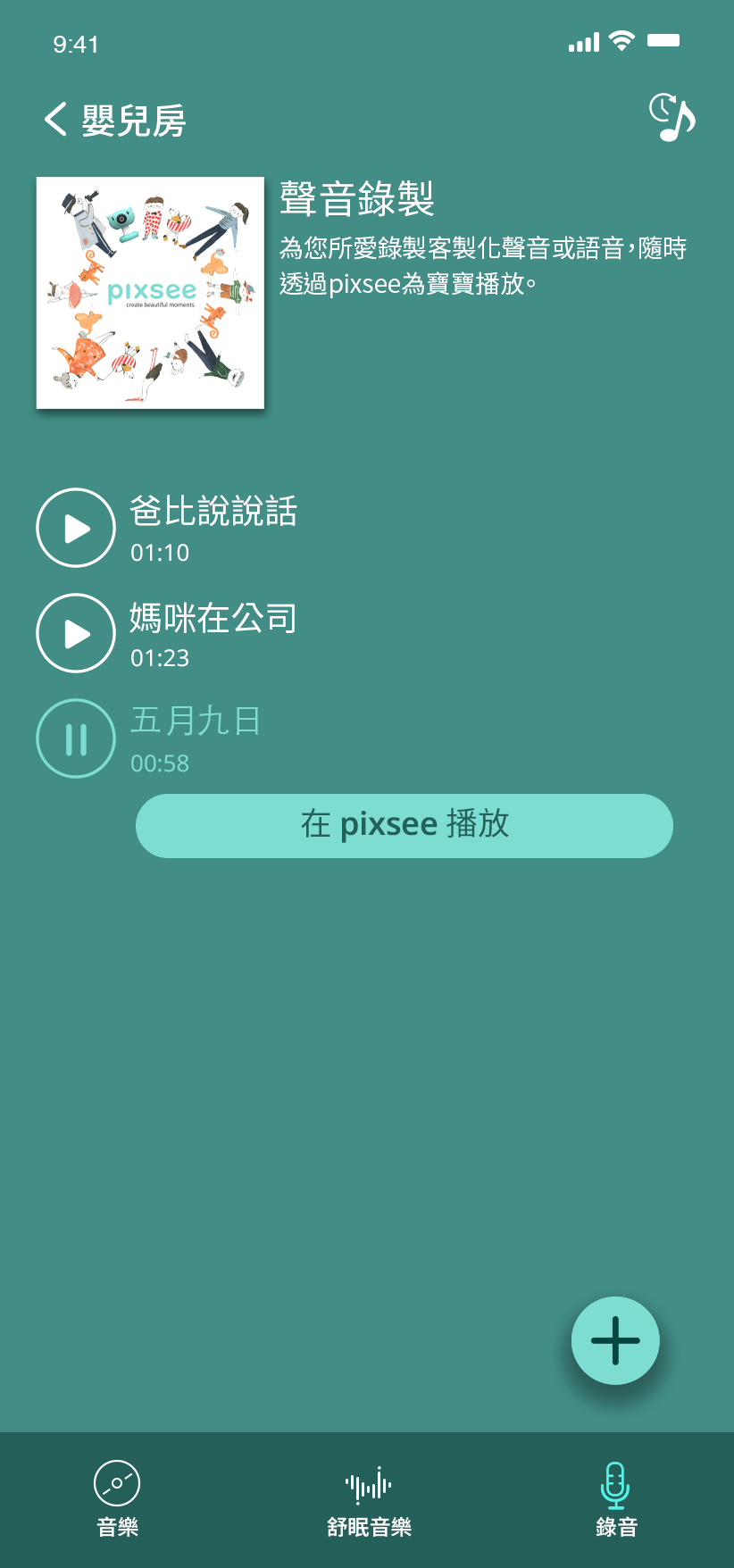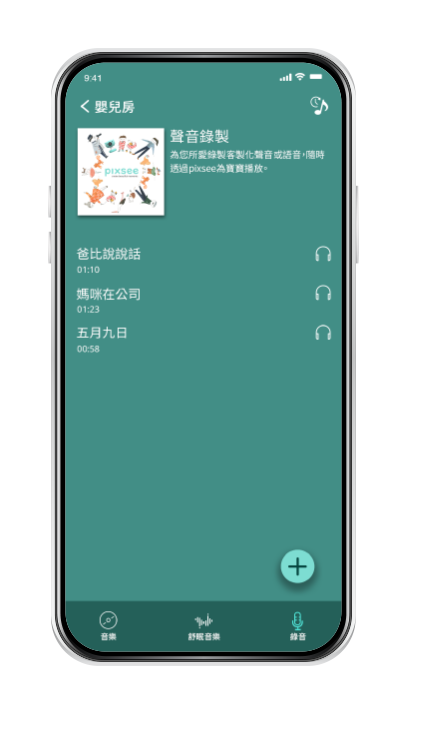 爸爸媽媽可錄製自己的聲音或語音,當不在寶寶身邊時,透過Pixsee播放給寶寶聽。