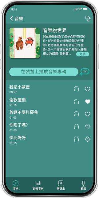 由音樂教育專家以「音樂說世界」、「樂聽越聰明」、「享樂在一起」三大主軸,配合孩子的作息活動、季節、節慶等精心打造歌單,擴展孩子的知識、智能、增進親子關係。