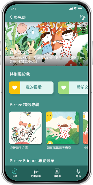 Pixsee Friends各自擁有專屬歌單,但您也能為寶寶和Pixsee Friends自製獨家歌單。 錄下您的聲音(或採專家所建議的"父母語",以拉長和提高的音調錄製),在App選定代表您的Pixsee Friend。Pixsee Play偵測Pixsee Friend後,以媽咪的聲音唱搖籃曲,或以爸比的聲音講故事,讓寶寶感到安心又能產生親密感。