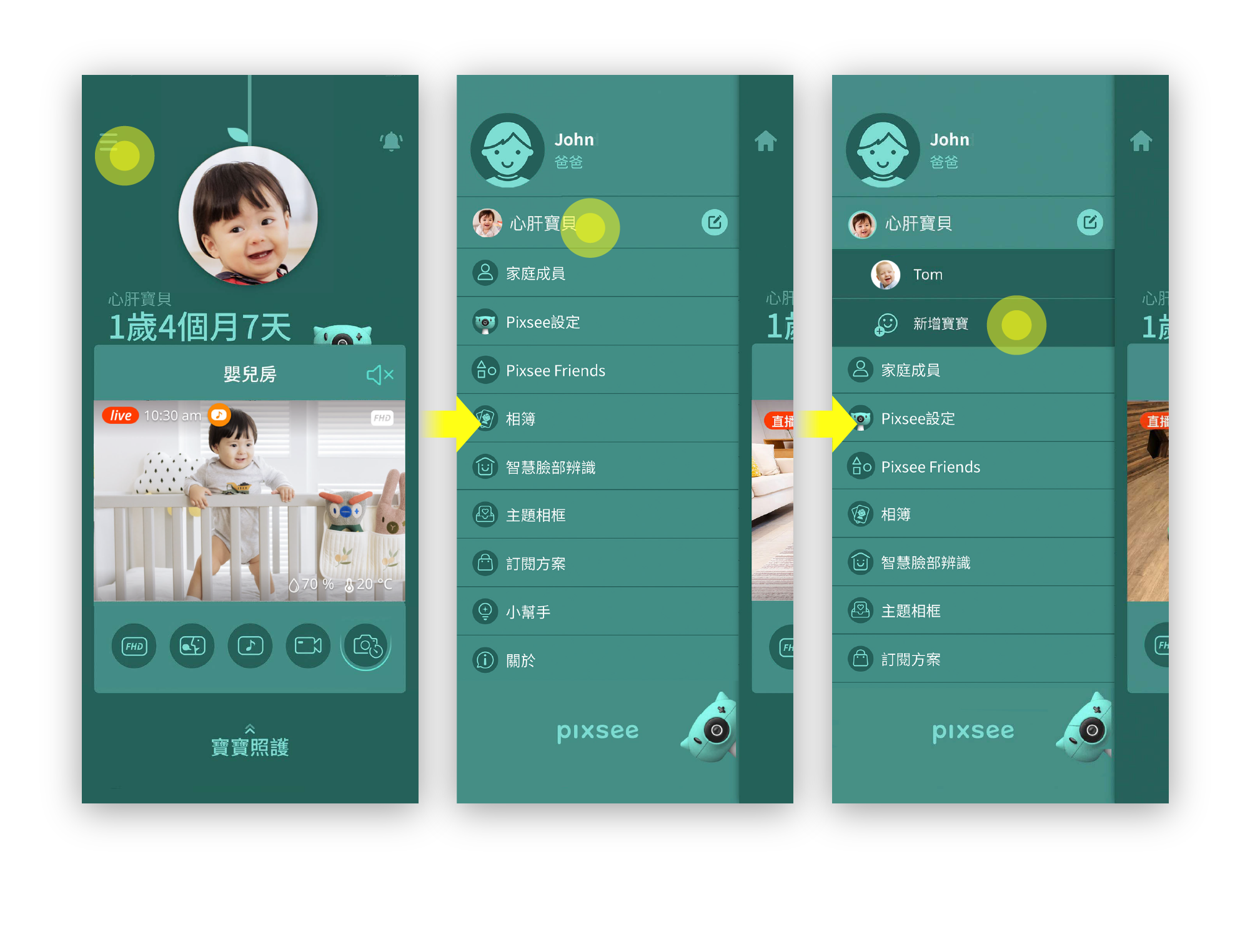 點選App首頁選單→點選"寶寶名稱"→選擇欲觀看的pixsee裝置