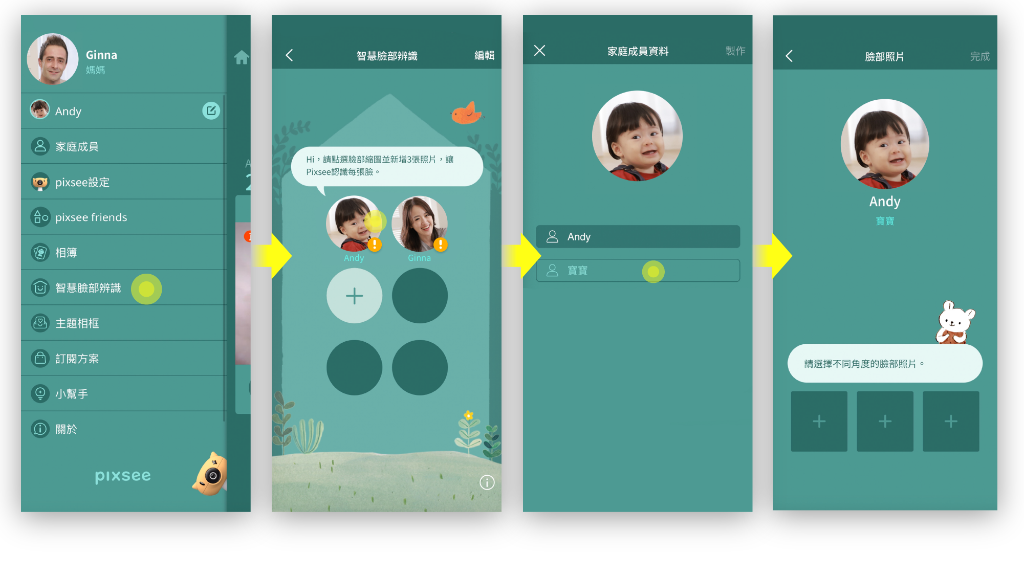 升級為Pixsee Planet金星方案會員,可以透過Pixsee App設定欲辨識的成員人臉,一個主帳號最多可設定6位成員(包含寶寶),設定完成後系統會自動集結並辨識人臉,透過Pixsee的智慧拍照機制篩選累積到足夠數量的照片後,便會自動生成專屬的回憶精選短片並搭配精選主題音樂,不定時推播至Pixsee App。