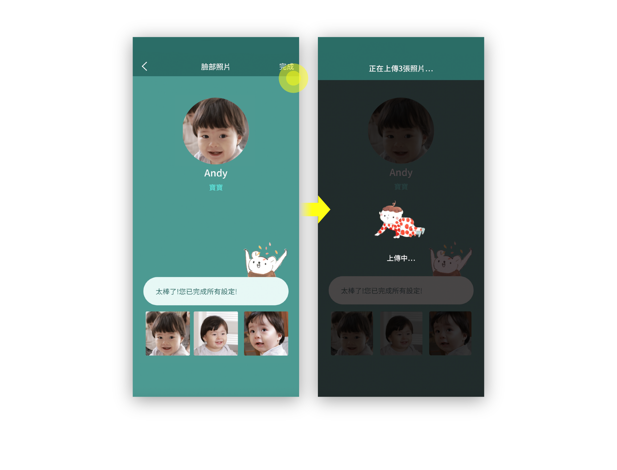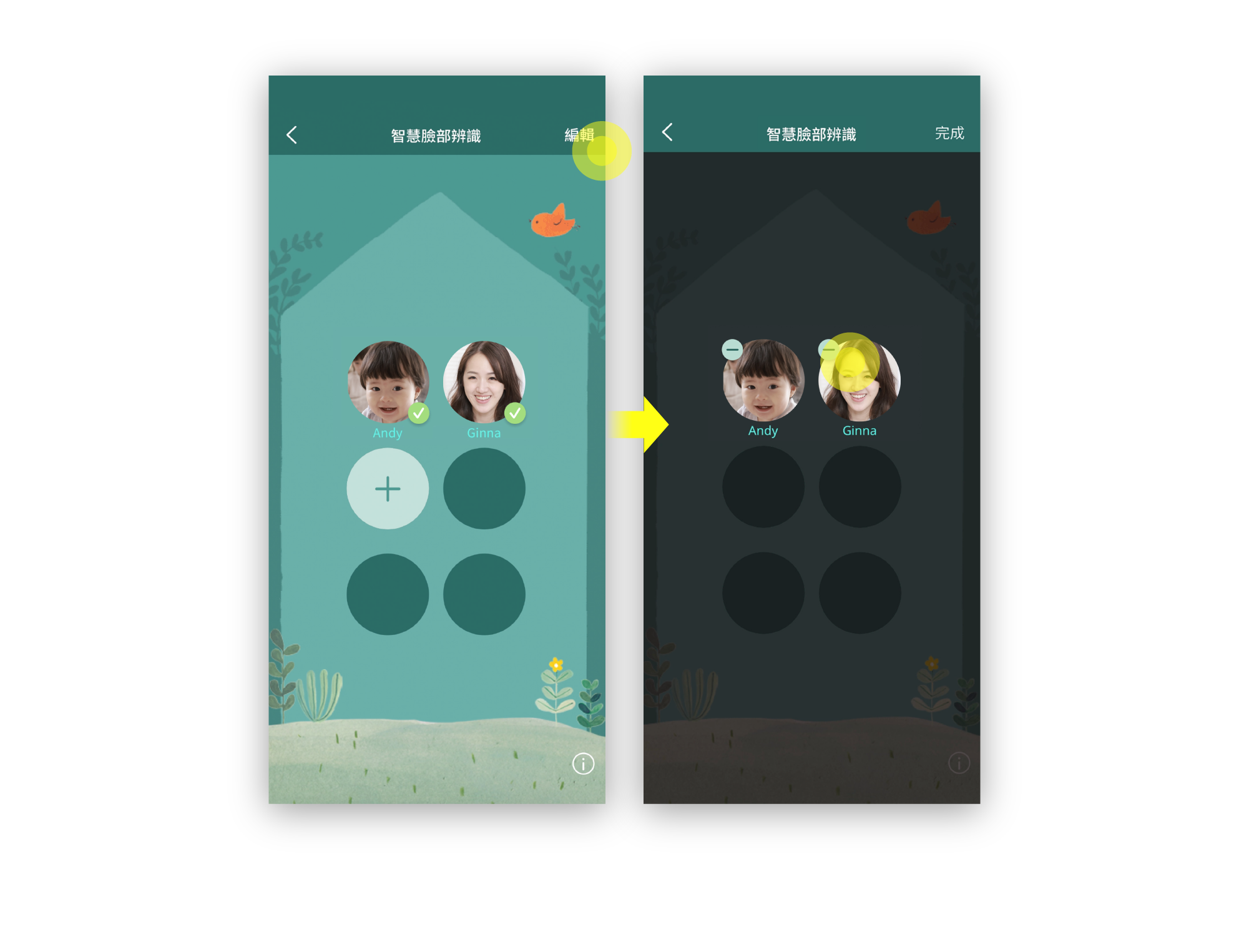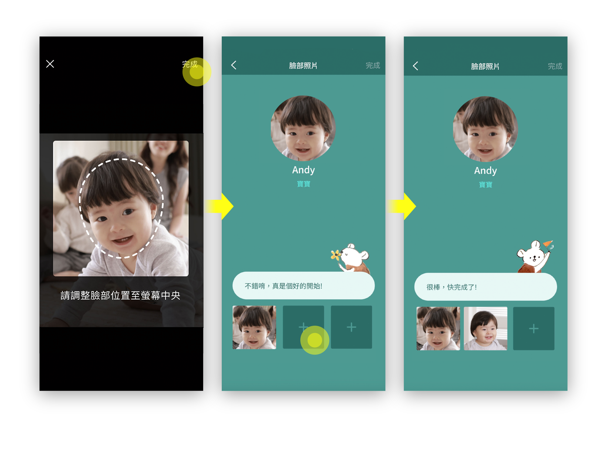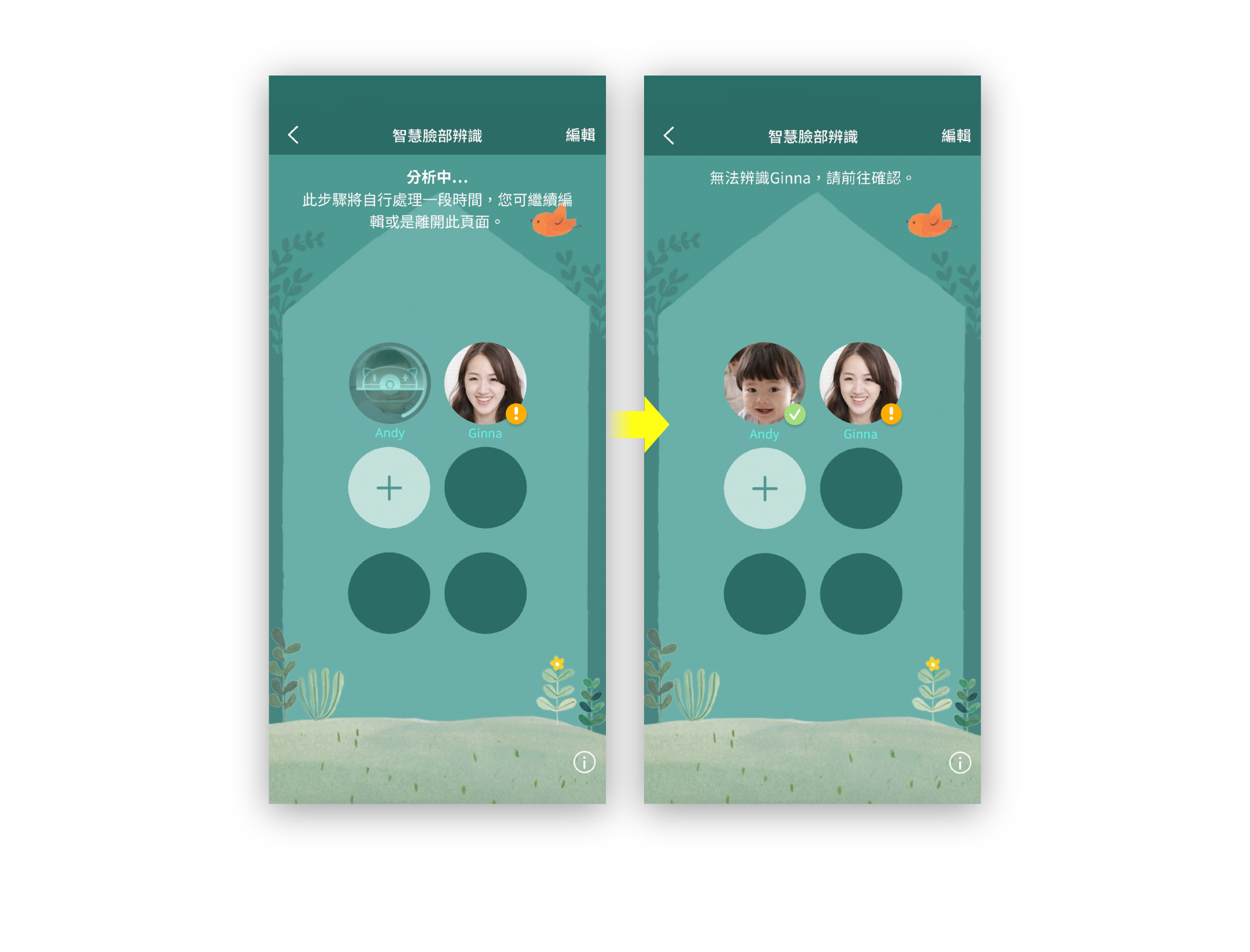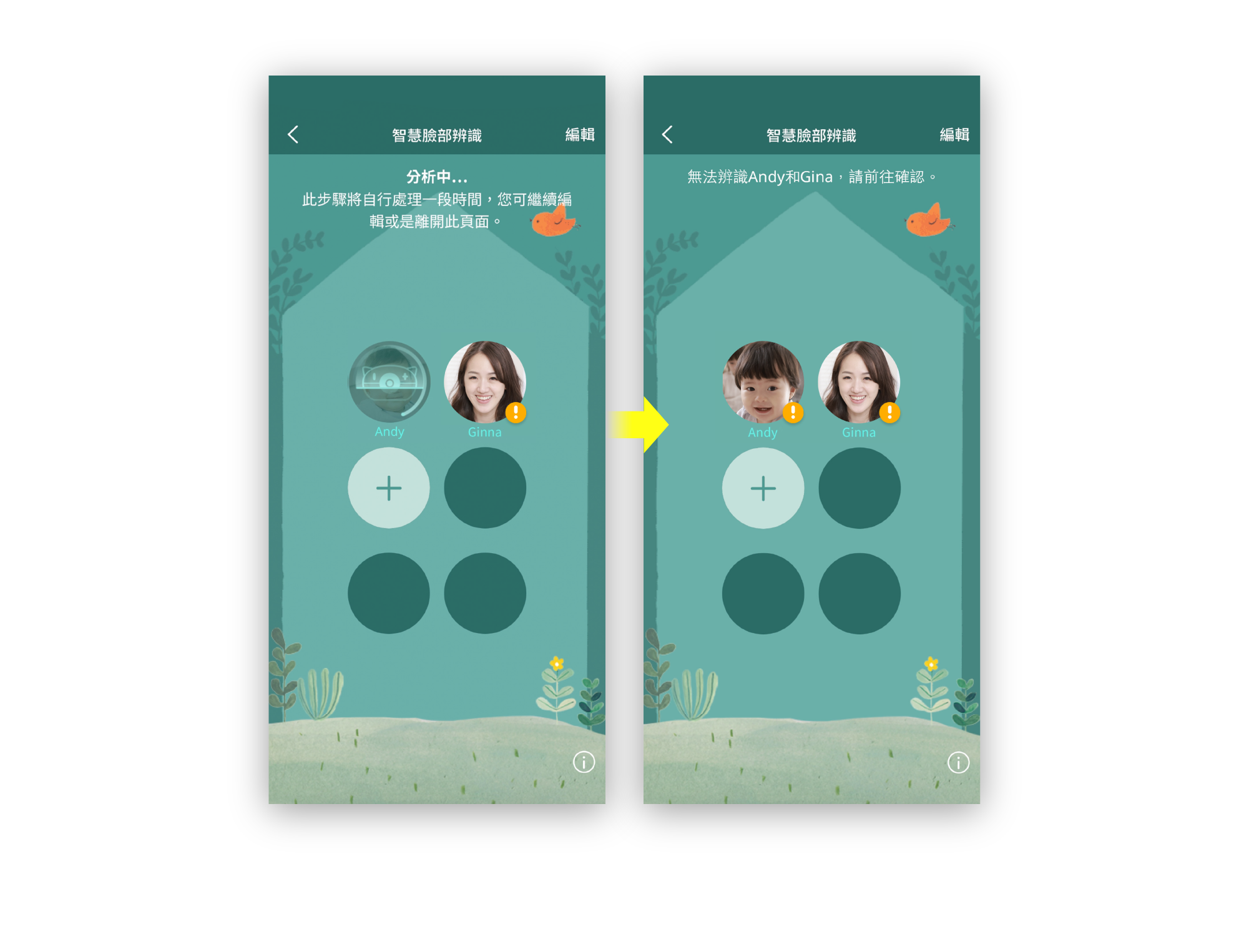 5. 分析結束後,頭像下方會出現綠色勾勾,表示分析成功,完成該成員的辨識設定。您可點選 + 號,繼續新增成員,最多可設定6位成員(包含寶寶)