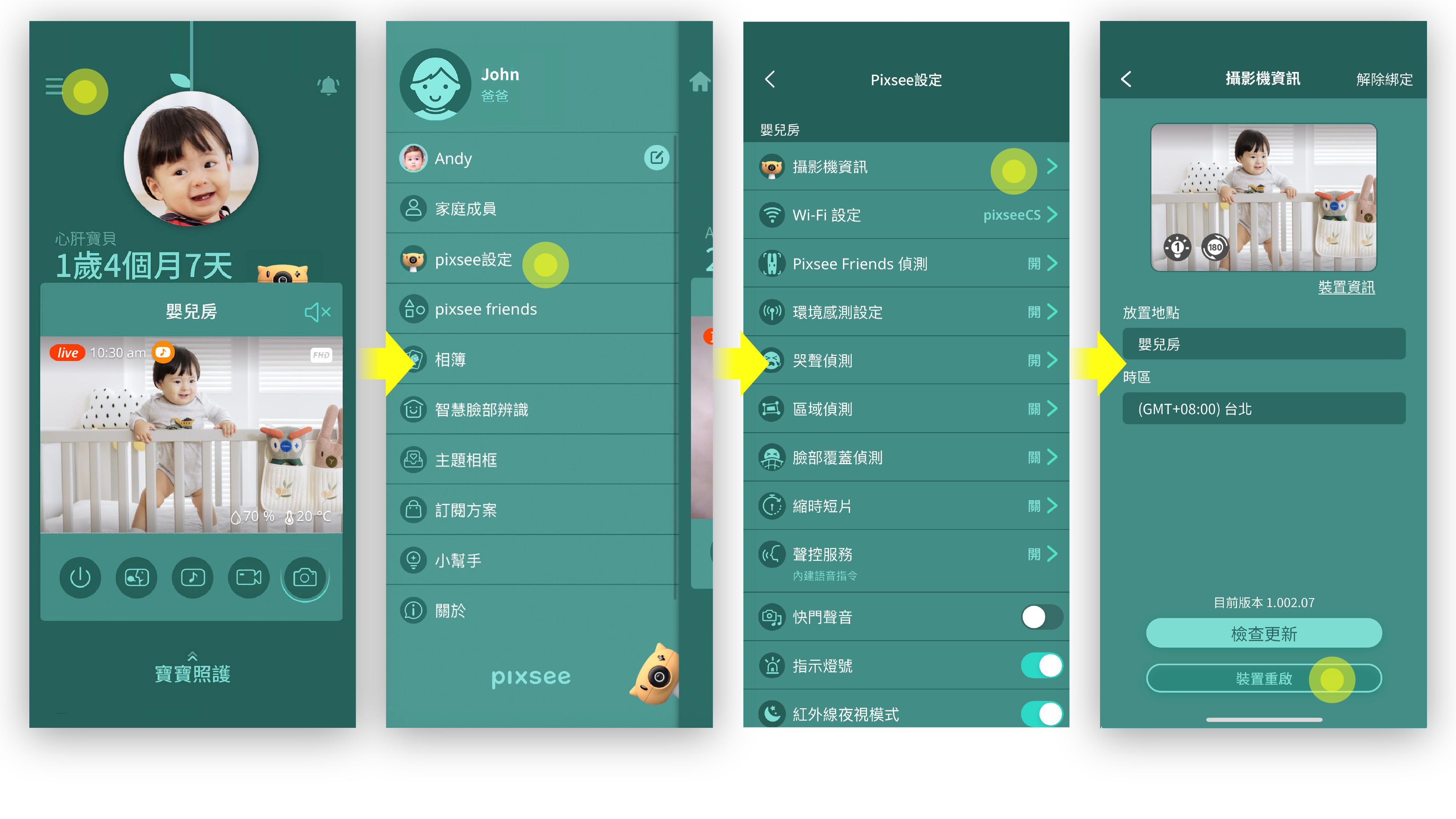 請進入App選單>Pixsee設定>攝影機資訊,點擊頁面最下方的「裝置重啟」。待裝置重啟完成並顯示綠燈恆亮後,即可正常使用。