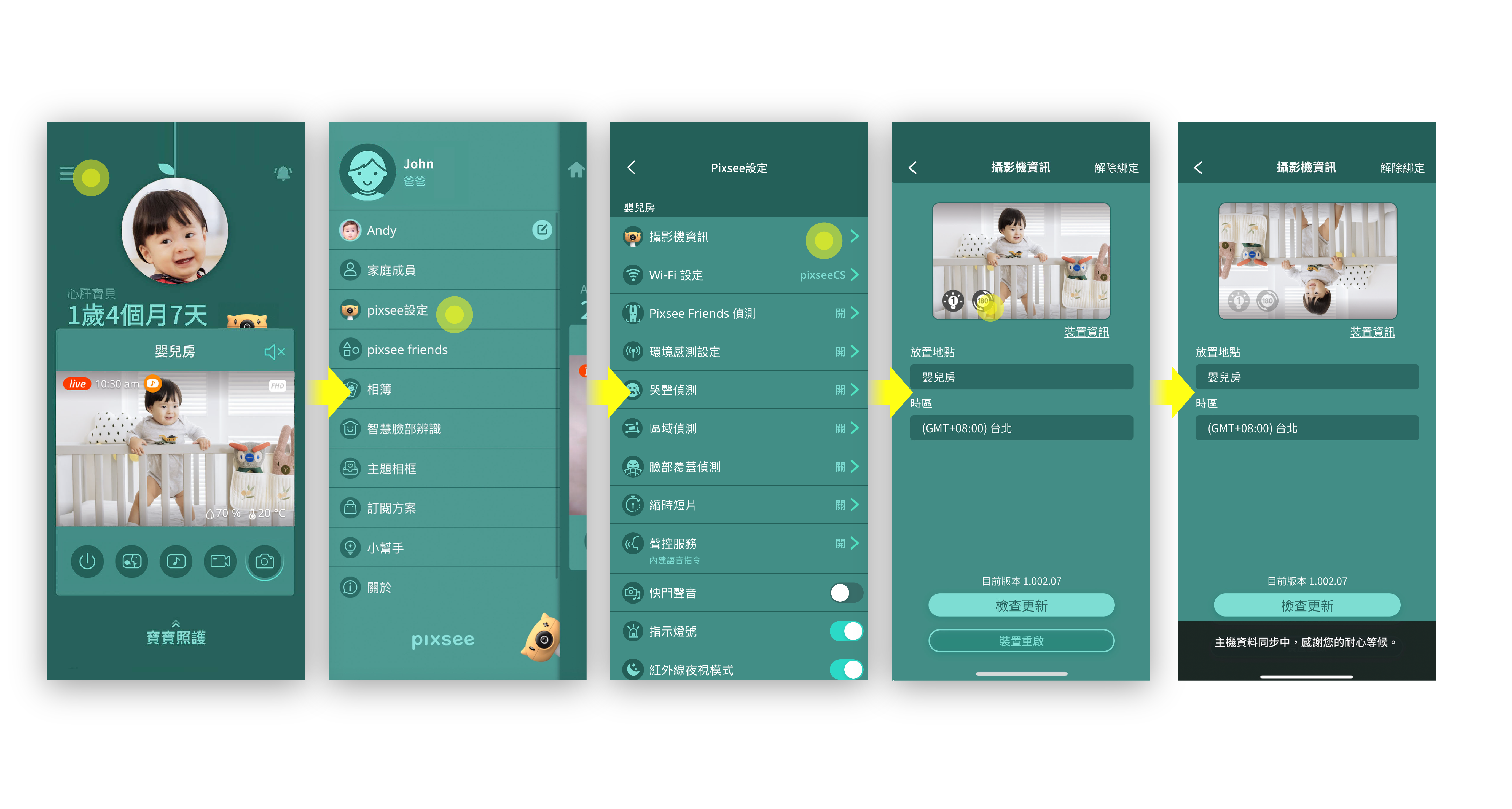 若因攝影機擺放位置導致畫面顛倒,爸爸媽媽可以進入App選單>Pixsee 設定>攝影機資訊,調整設定讓畫面翻轉,讓照護視角更加彈性與便利。