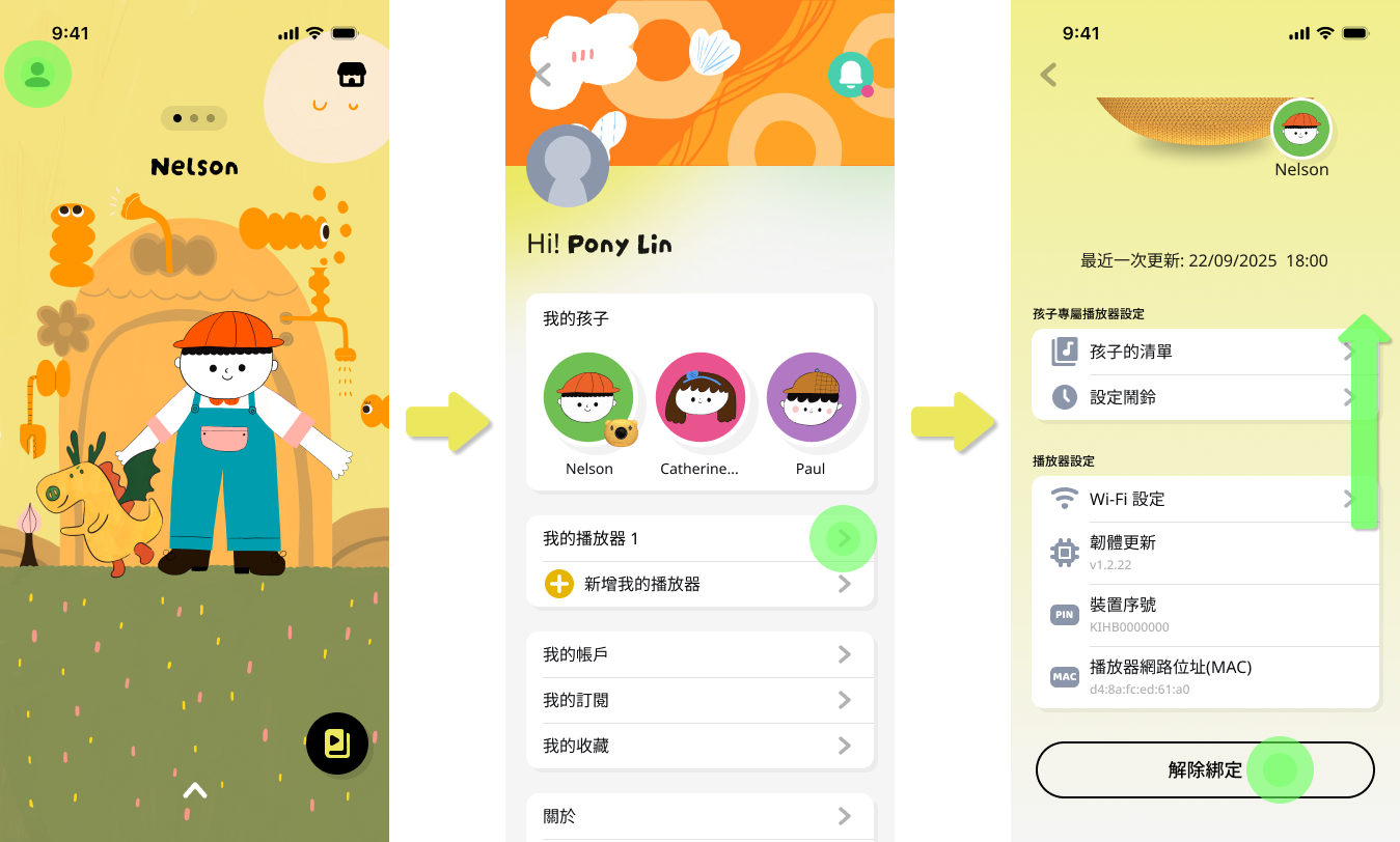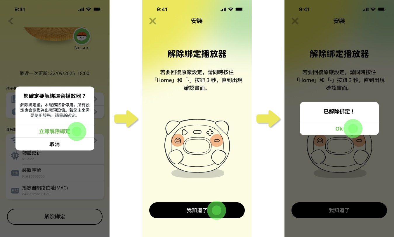 請點選App首頁選單>「我的播放器」>至最下方點選「解除綁定」>依指示完成解除綁定