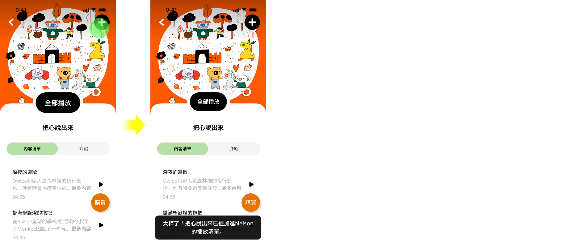 3.您可以新增或刪除故事集,也可以長按並拖曳故事集來調整播放順序。(每位孩子最多可設定 9張故事集)。