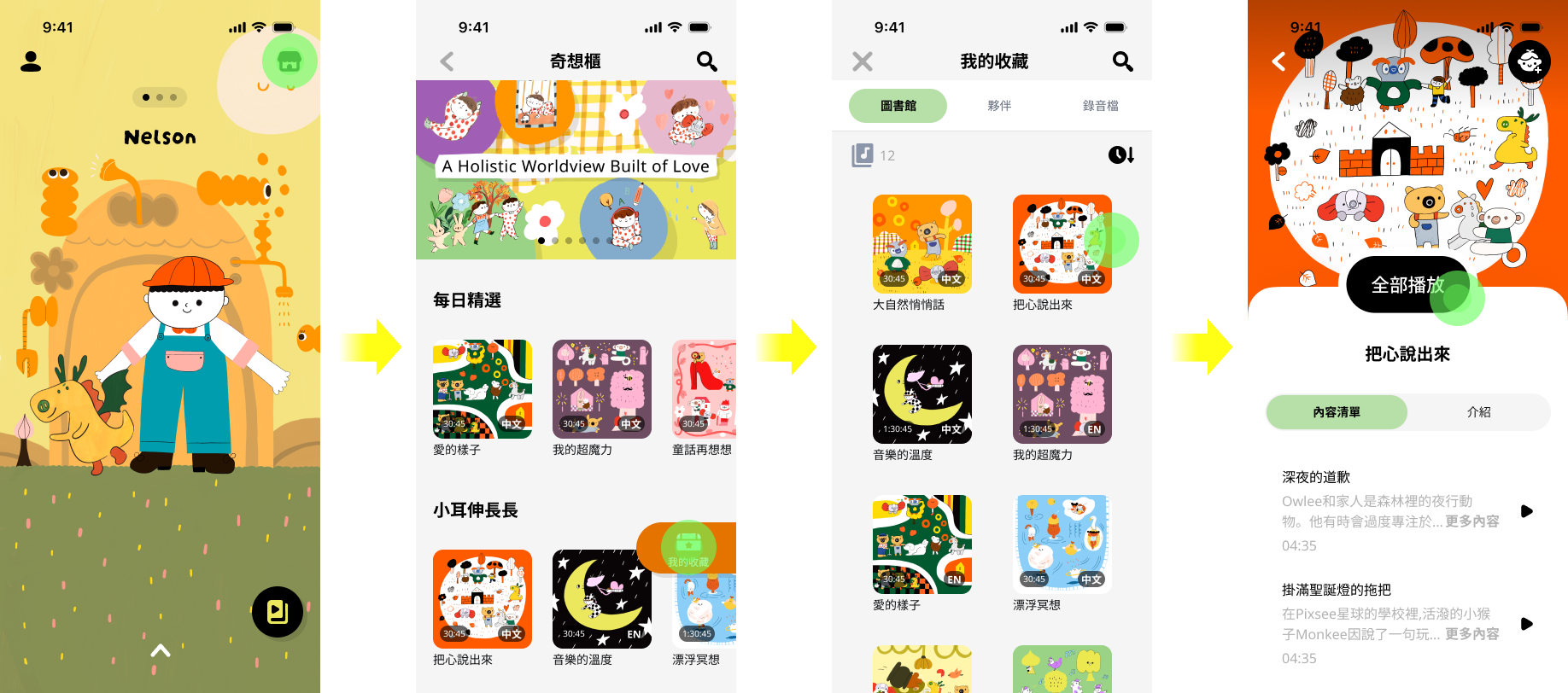 在 Pixsee Wonders App 首頁右上方點選進入「奇想櫃」或「我的收藏」中點選故事集直接播放;播放時請保持 App 開啟並停留在播放頁面,以確保不中斷。