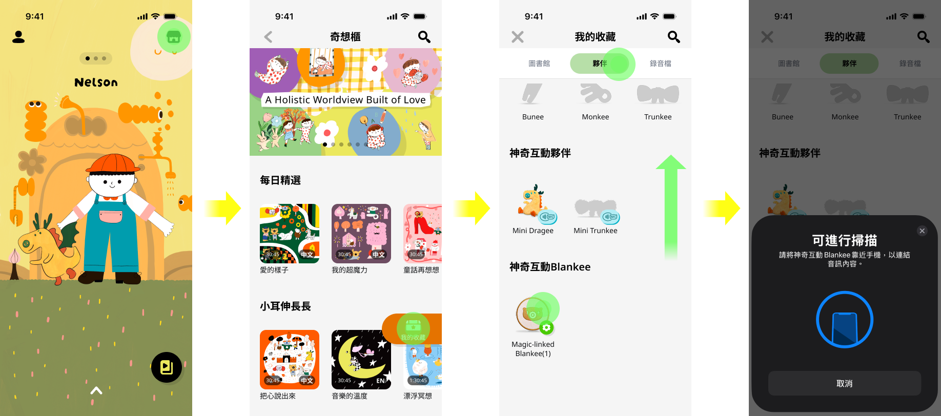 一個 Blankee 可同時設定「一張故事集+多筆錄音檔(最多50筆)」,完成設定後即可使用同一個 Blankee來感應聆聽。