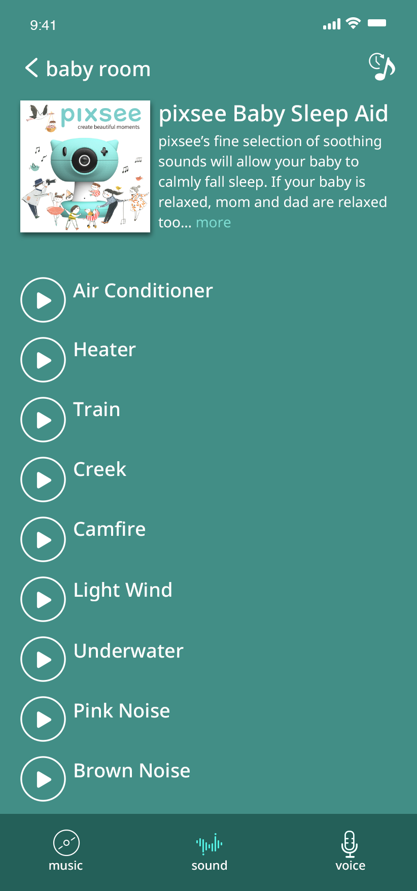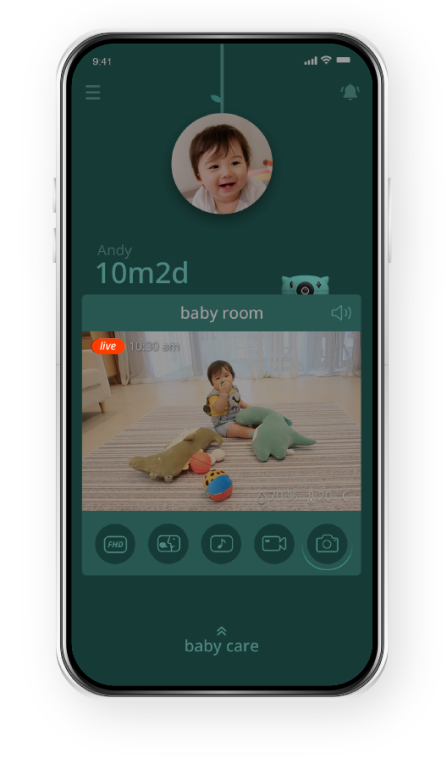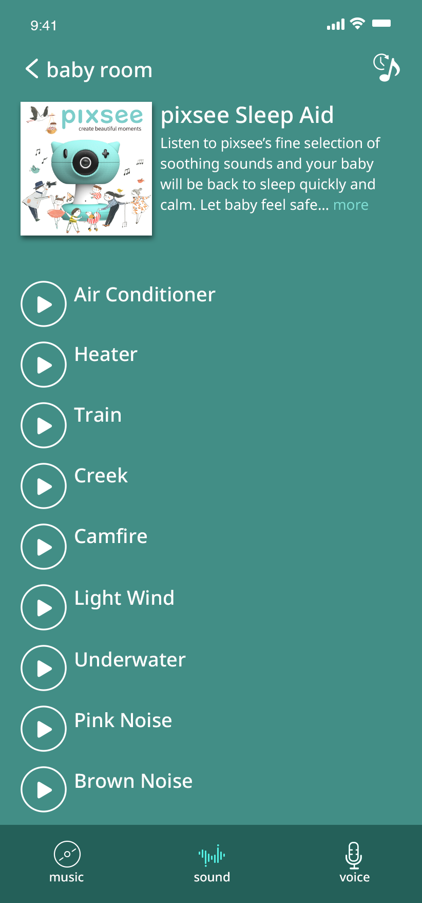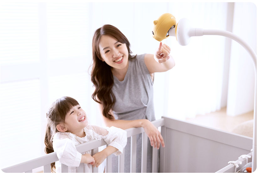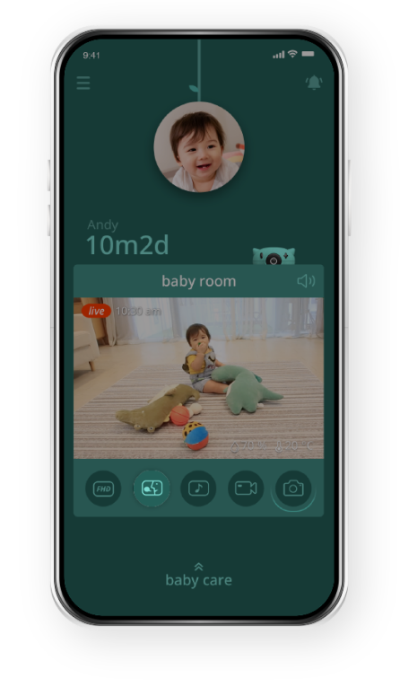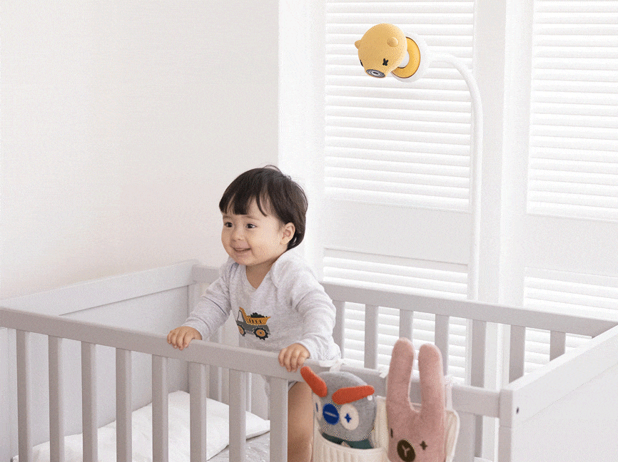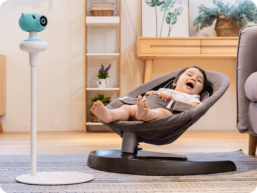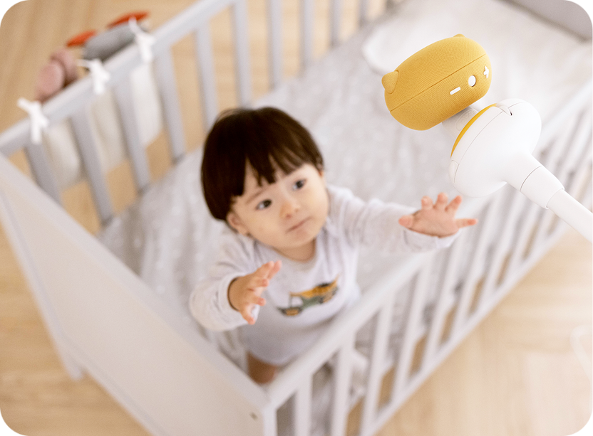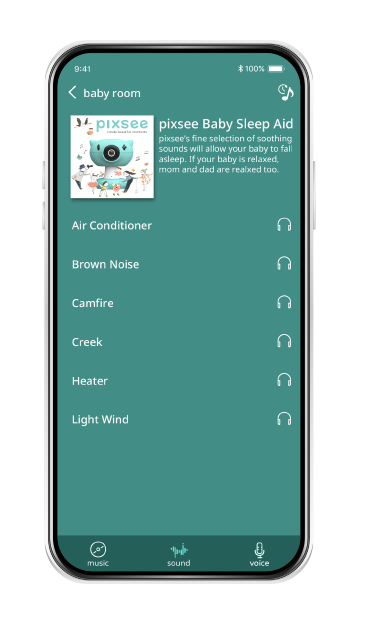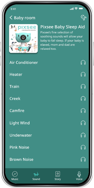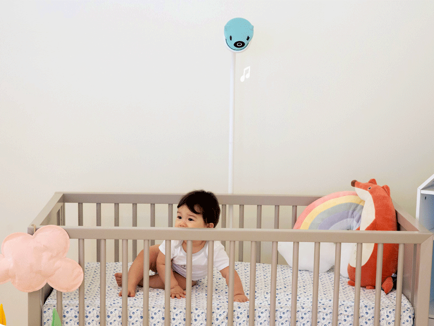 Pixsee automatically detects your baby’s cries and settles them with calming tunes.