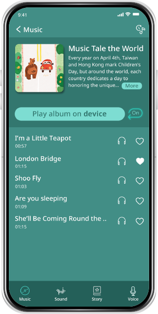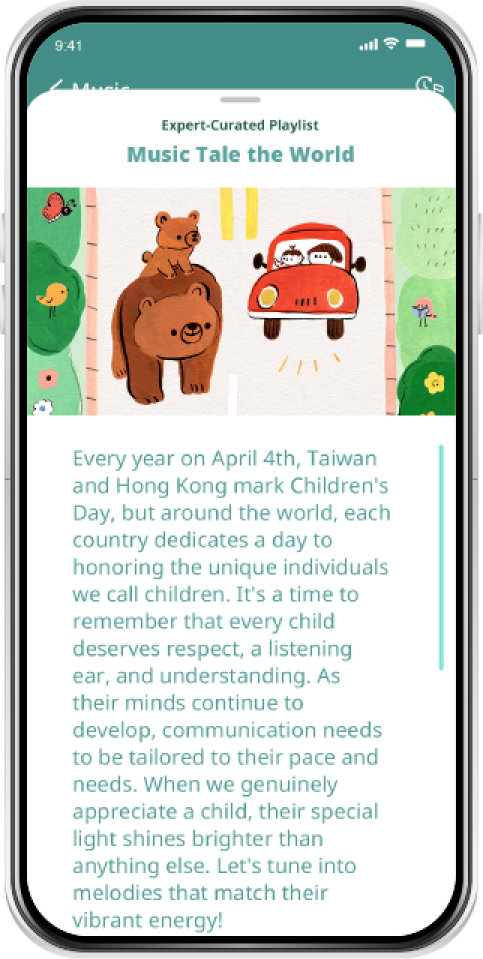 Our music education experts carefully create playlists based on three themes: "Music Tales the World," "Music Fuels the Mind," and "Having Fun Together." These playlists adapt to your little one's daily routine, seasons, and celebrations, fostering knowledge, intelligence, and the parent-child bond.