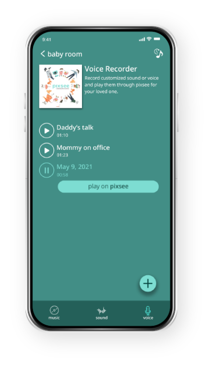 Parents can record their own voices and customized sounds, which then can be played through Pixsee to their little ones when they are away.