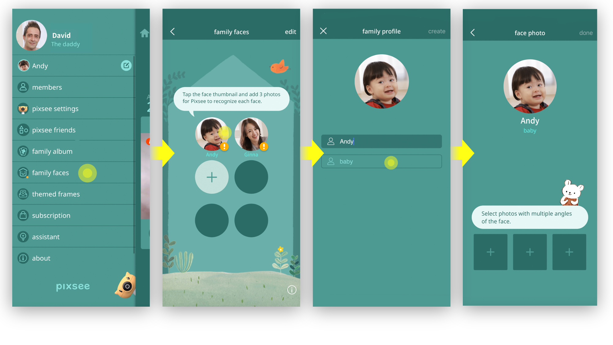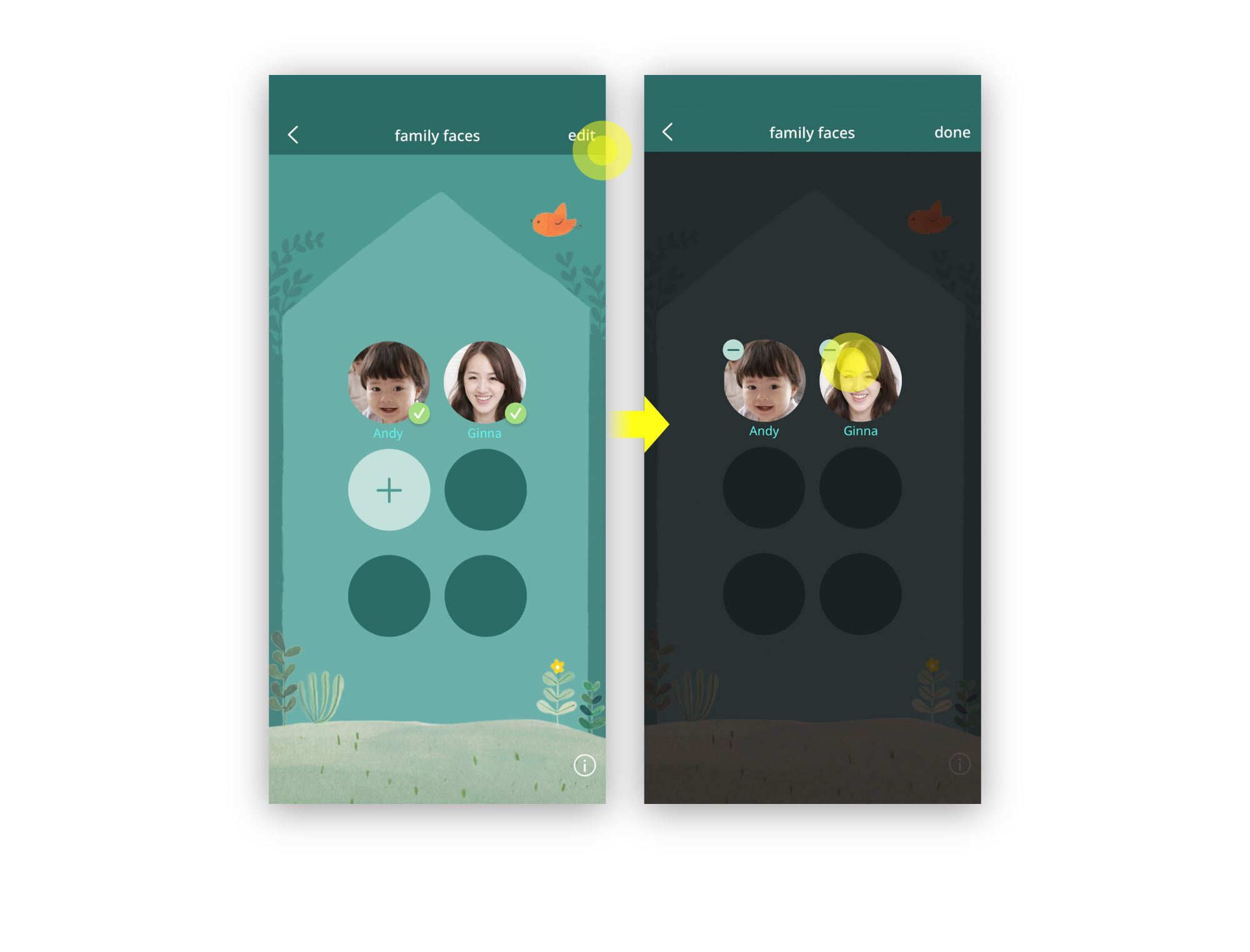 Enter menu from the App > Tap family faces > Set the faces you want to be recognized; each member needs to provide three photos.