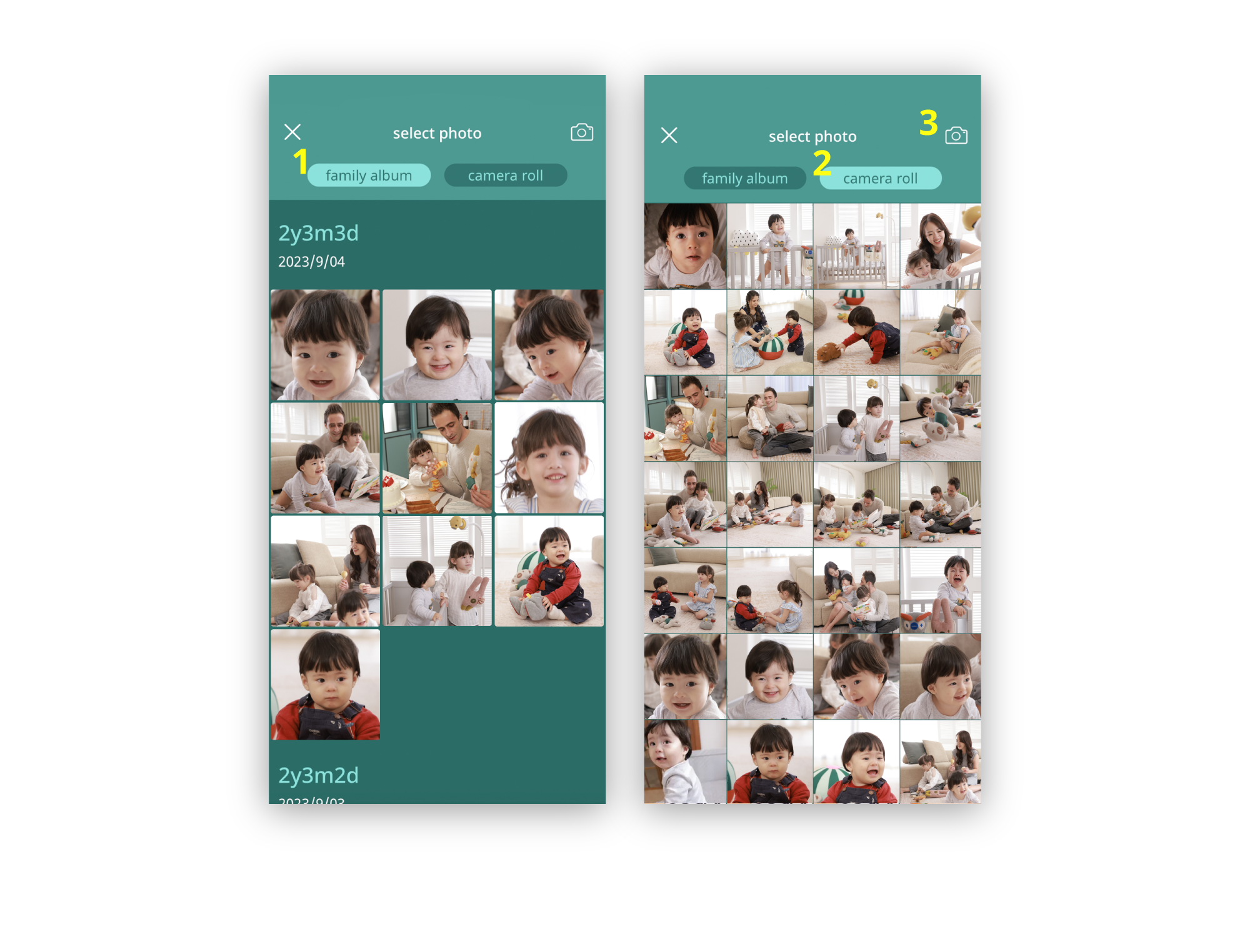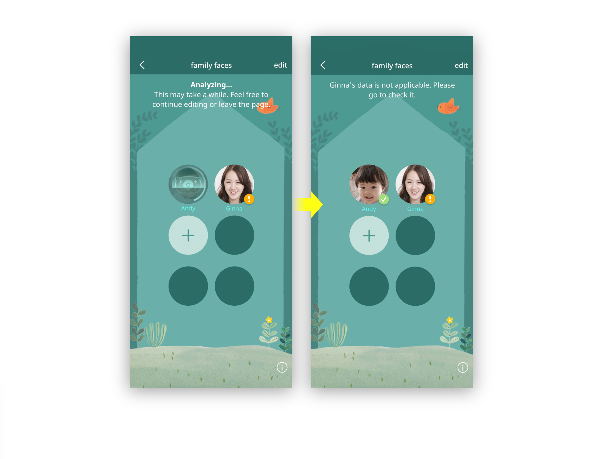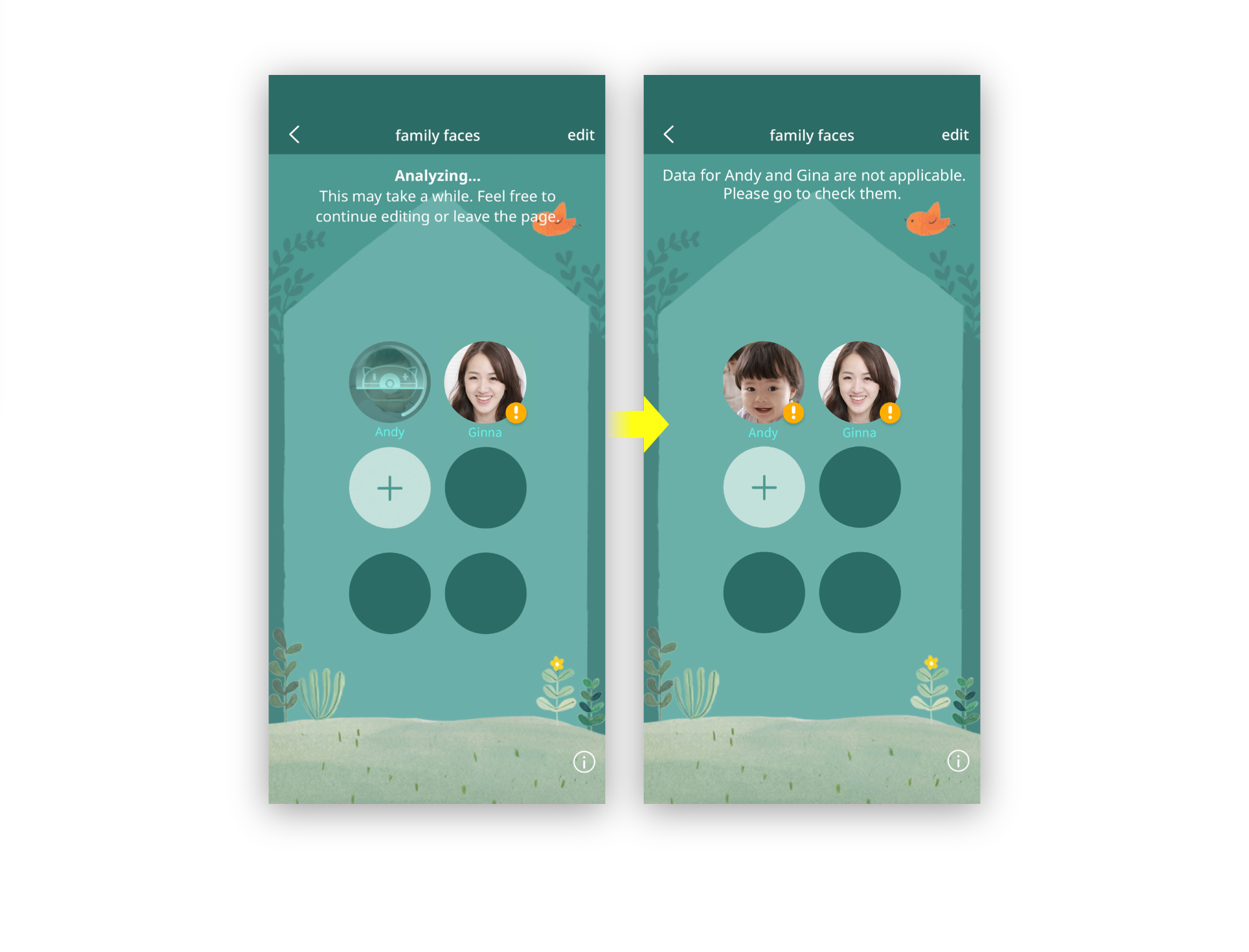 * If an exclamation mark appears below a member's profile, it indicates a failed photo analysis. Please tap again to select new photos and upload them to complete the analysis until a green checkmark appears.