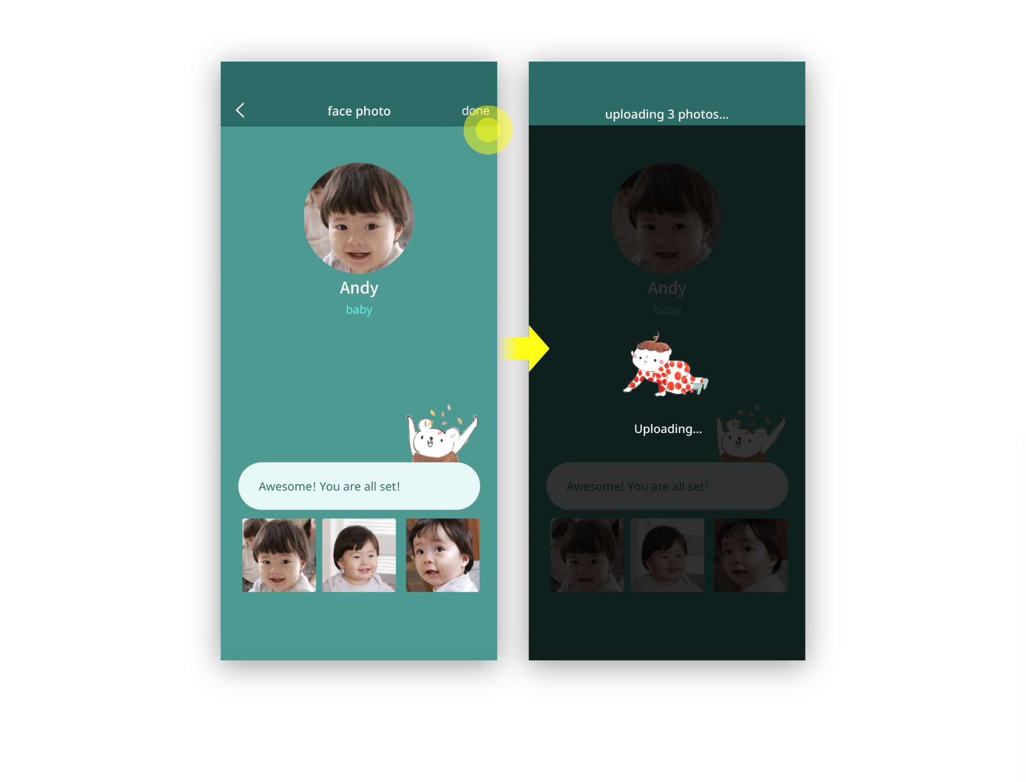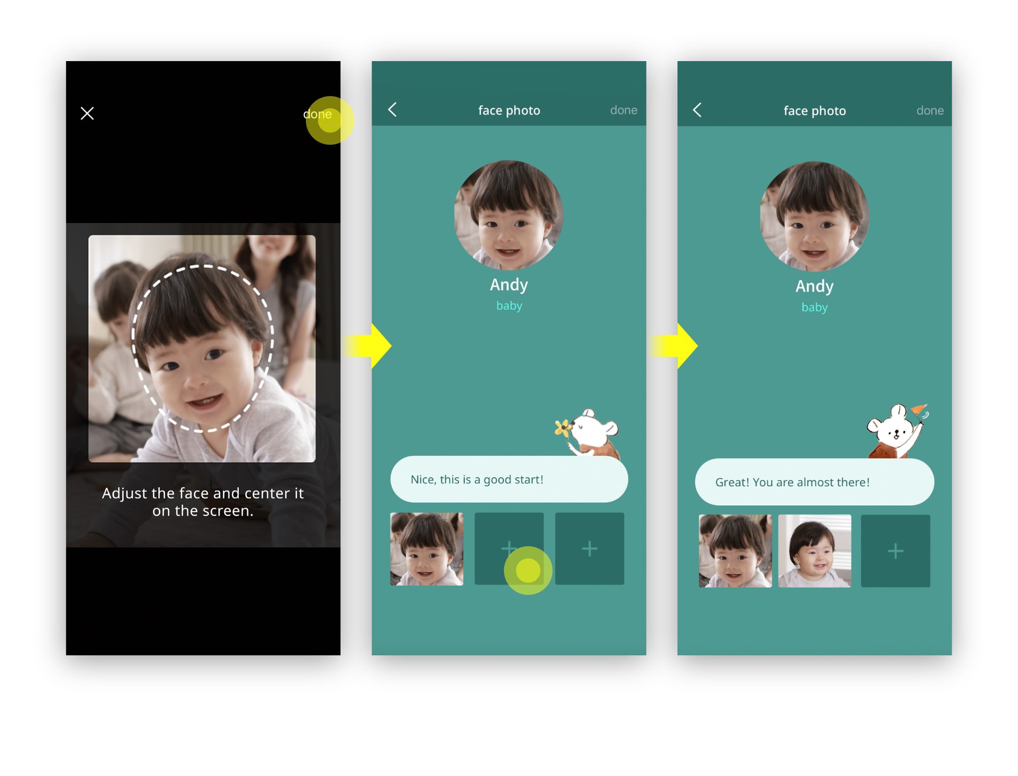 After the analysis and member recognition setup are successfully completed, a green checkmark will appear below the member's profile. You can add up to 6 members, including one baby, by tapping the β€œ+” icon.
