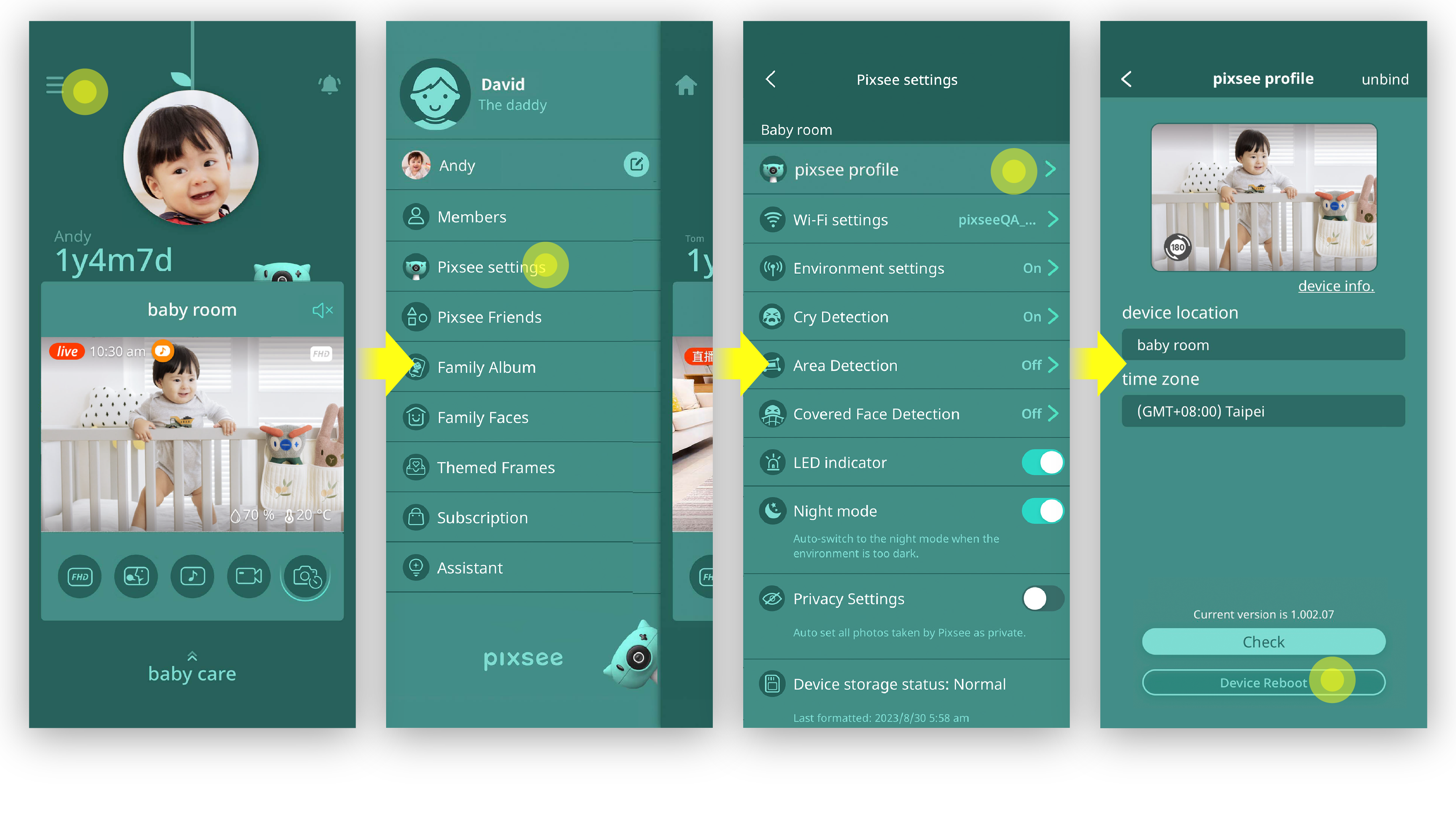 Please go to the App menu > Pixsee Settings > Pixsee profile, and click "Device Reboot" at the bottom. Once the device has restarted and the indicator light turns solid green, it will be ready for use.